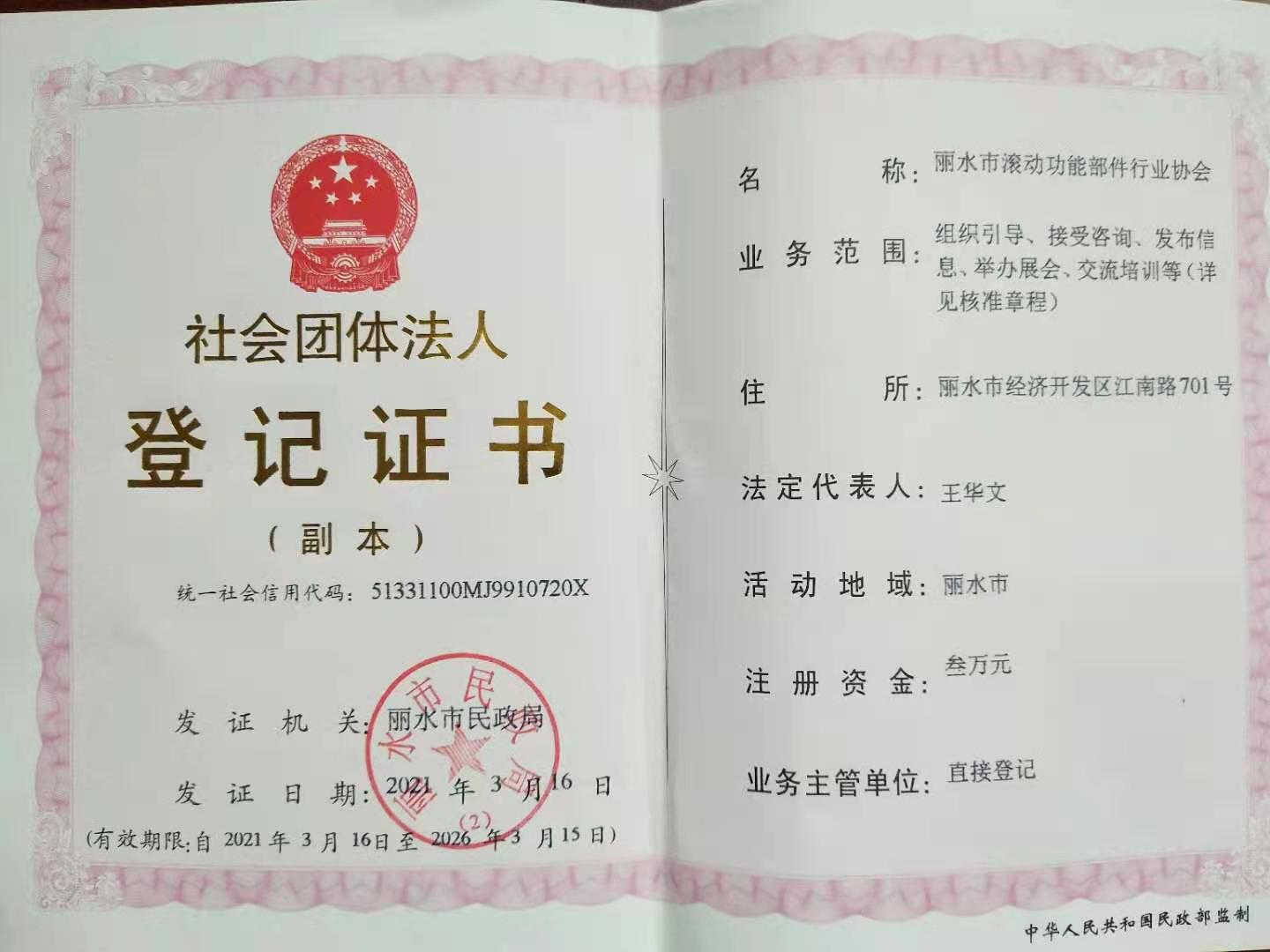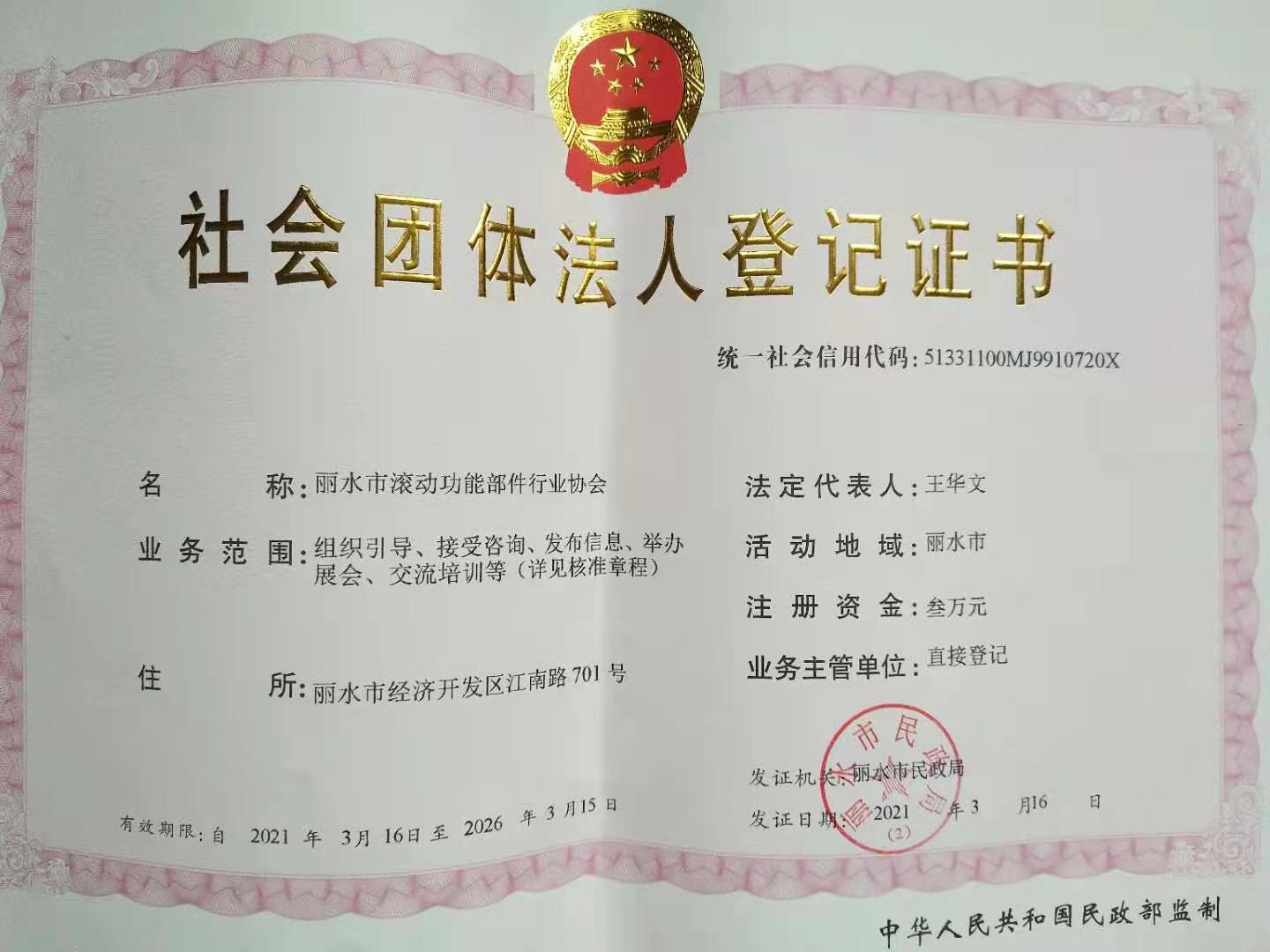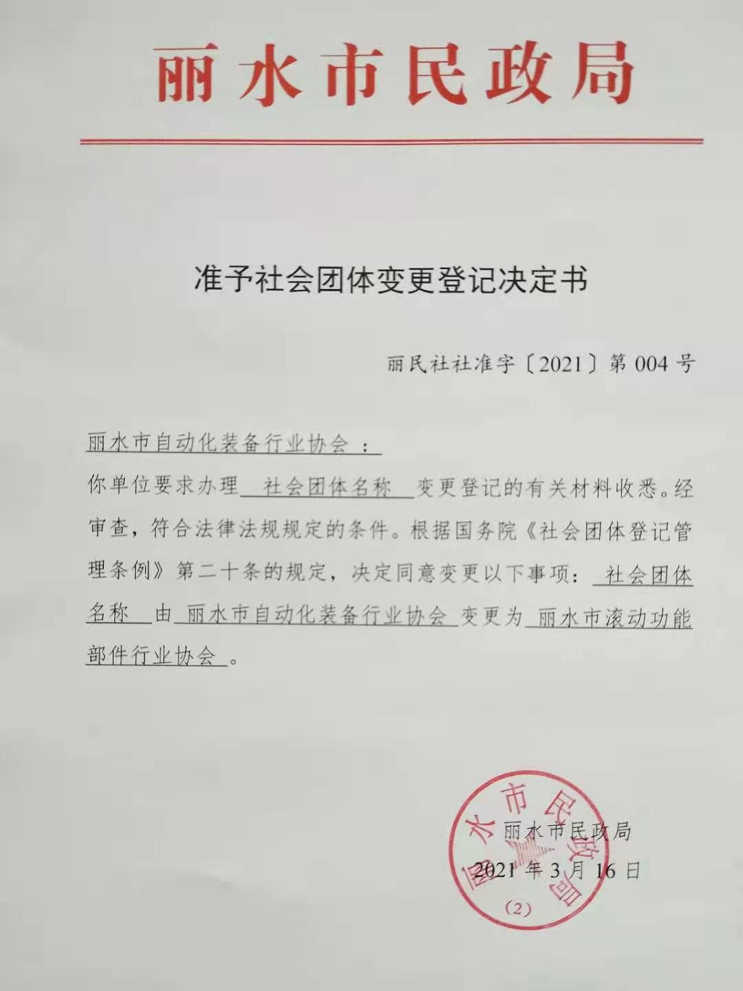 ? ? ?通過必要的法定程序,2021年3月16日,麗水市民政局出具準予社會團體變更登記決定書,決定同意將“麗水市自動化裝備行業協會”變更為“麗水市滾動功能部件行業協會”。